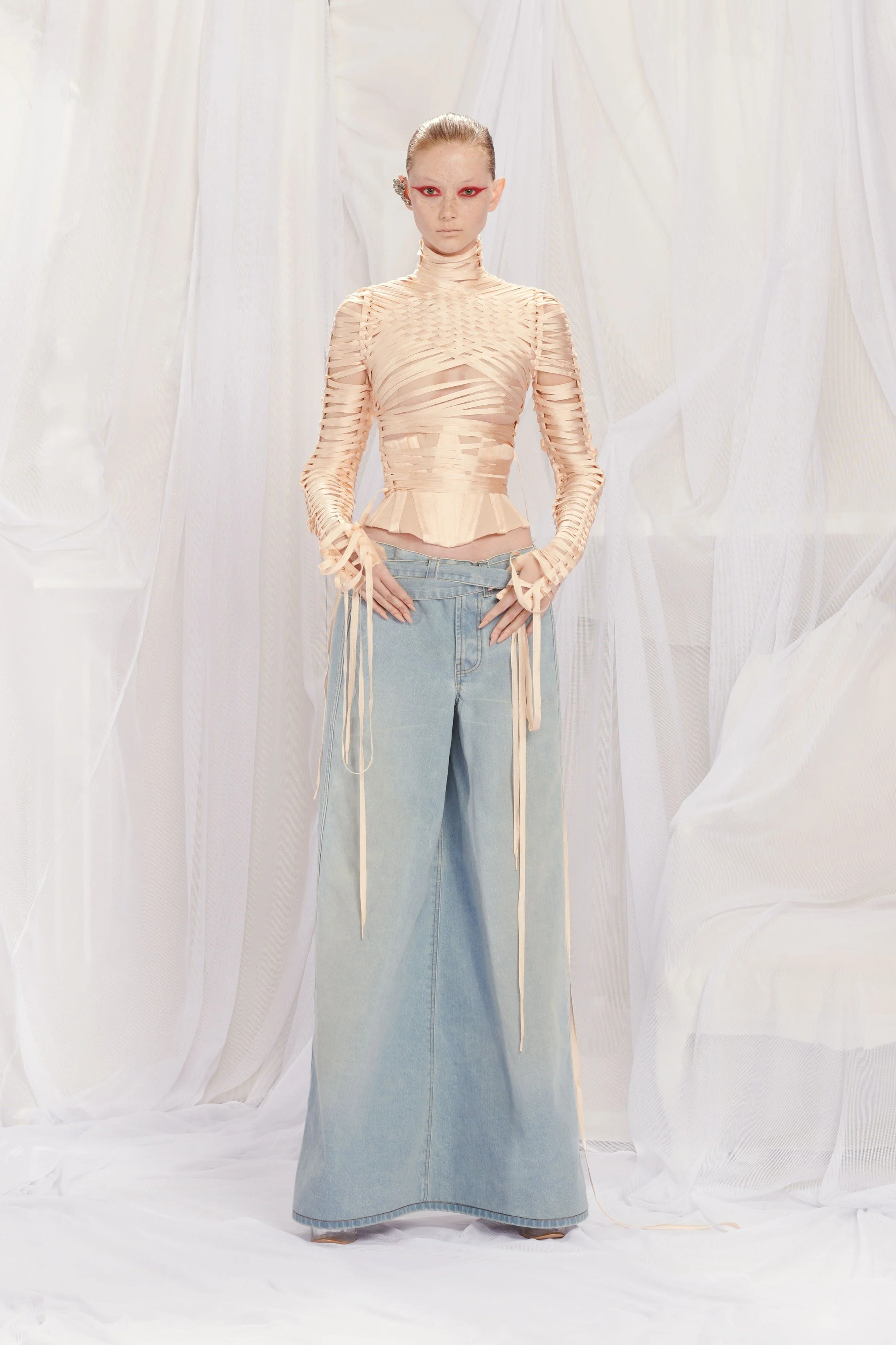 Martens’ work for Gaultier was sensual yet biting. Martens faithfully interacted with Gaultier’s repertoire of boudoir glamour, with a recurring theme of Martens signature abstraction, contoured into couture silhouettes. The true signal of Martens’ maturation and sheer ability was Look 18 - a ballet slipper-rose bodice styled with flowing denim. The select few who can communicate denim into couture with sincerity earn their place in history.